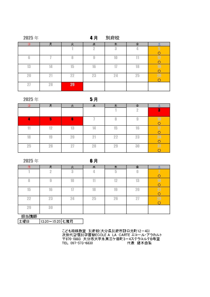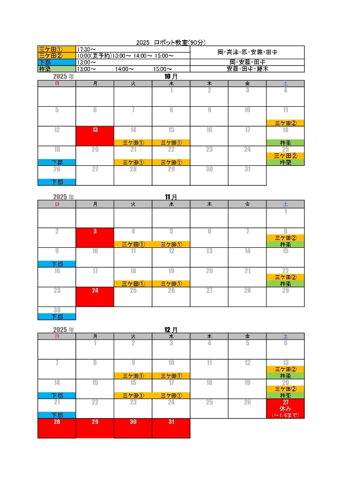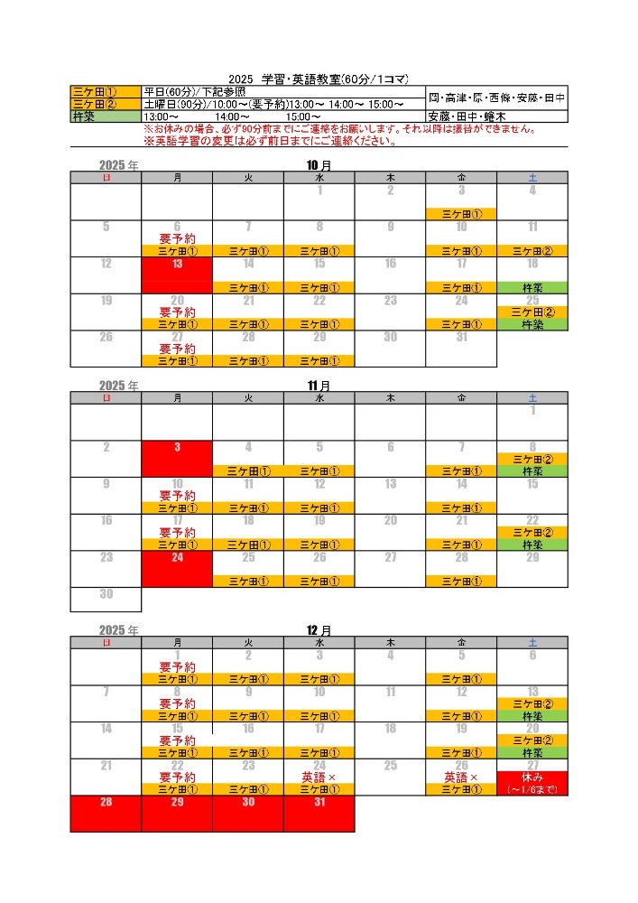 2025年10~12月分。変則的なところがありますのでご注意ください。・南大分教室・大道教室・別府教室